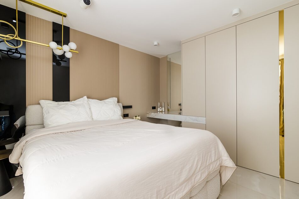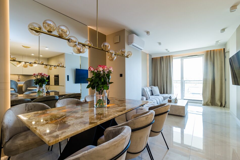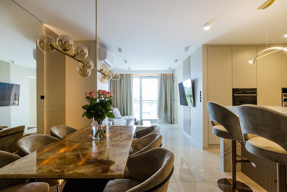 Apartament został wykończony z dbałością o detale przy użyciu materiałów najwyższej jakości. Dzięki licznym lustrom apartament wydaje się optycznie większy. Za aranżację wnętrz odpowiadał doświadczony projektant.