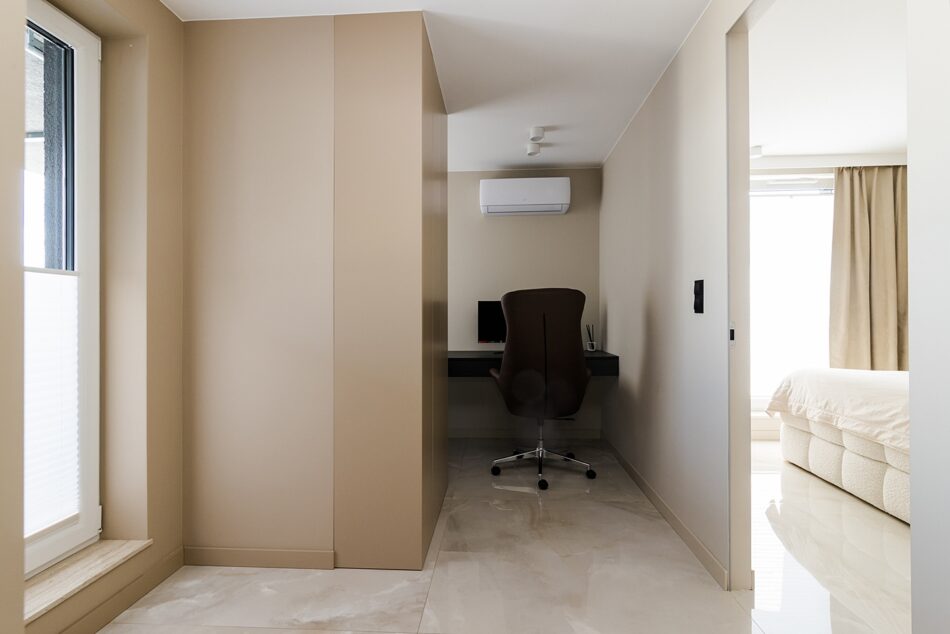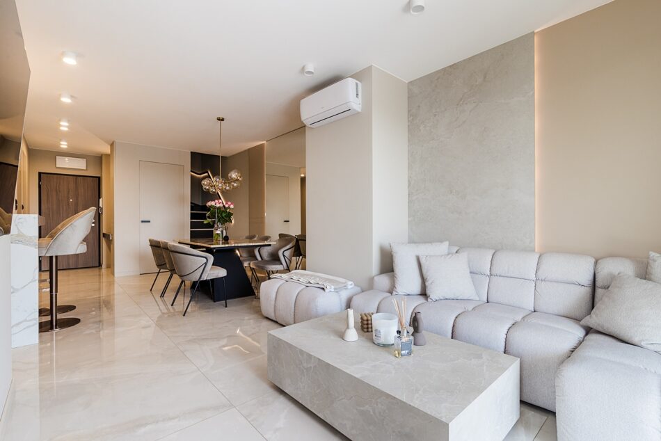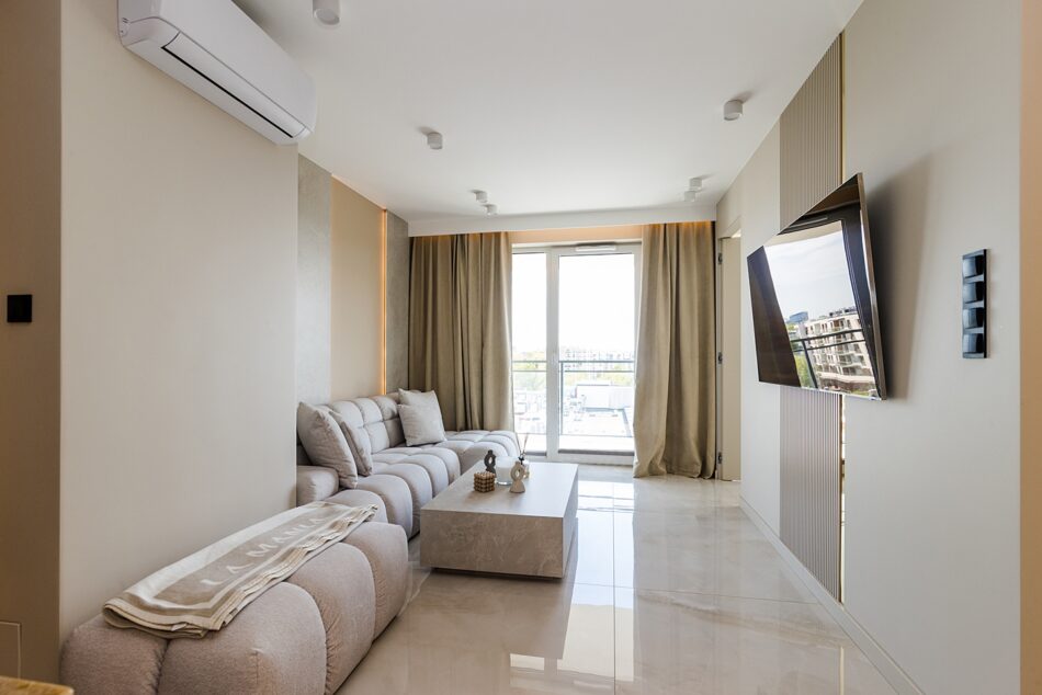 - W całym apartamencie zamontowane są dwie klimatyzacje. Jedna znajduje się w salonie, druga na piętrze.