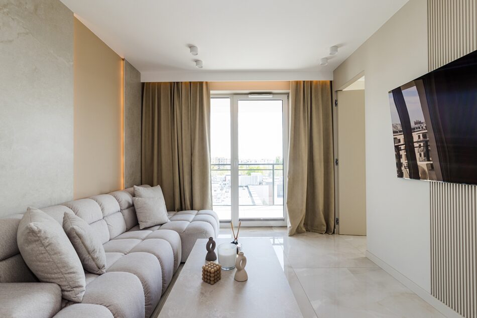 - Salon z jadalnią wyposażony w sofę marki Ramaro i stoliki kawowe – idealne miejsce do relaksu z widokiem na miasto.