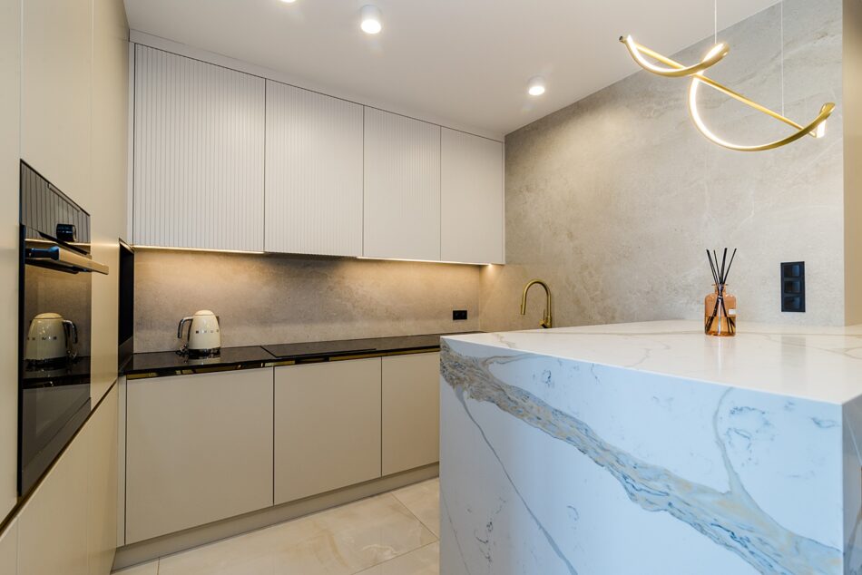 - W jadalni: zabudowa stolarska typu „paneling ścienny” oraz duży, podświetlany stół z onyksu.