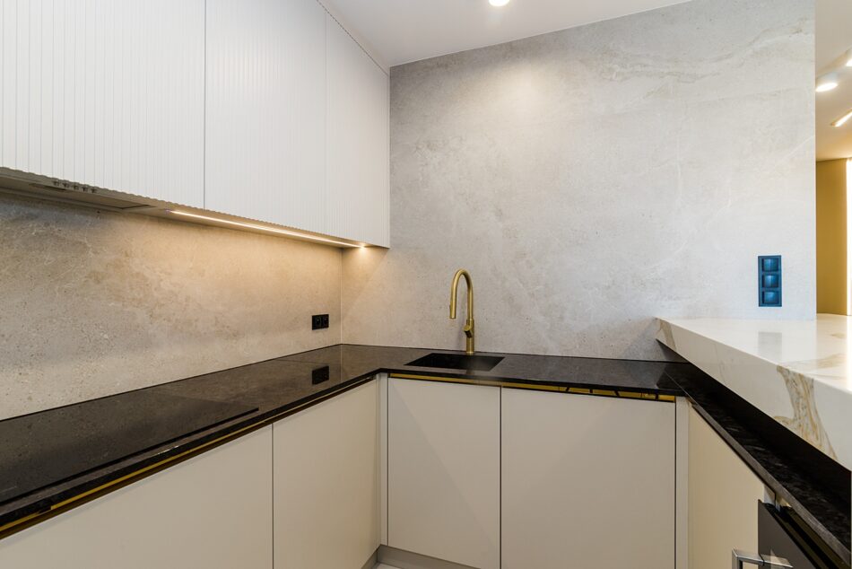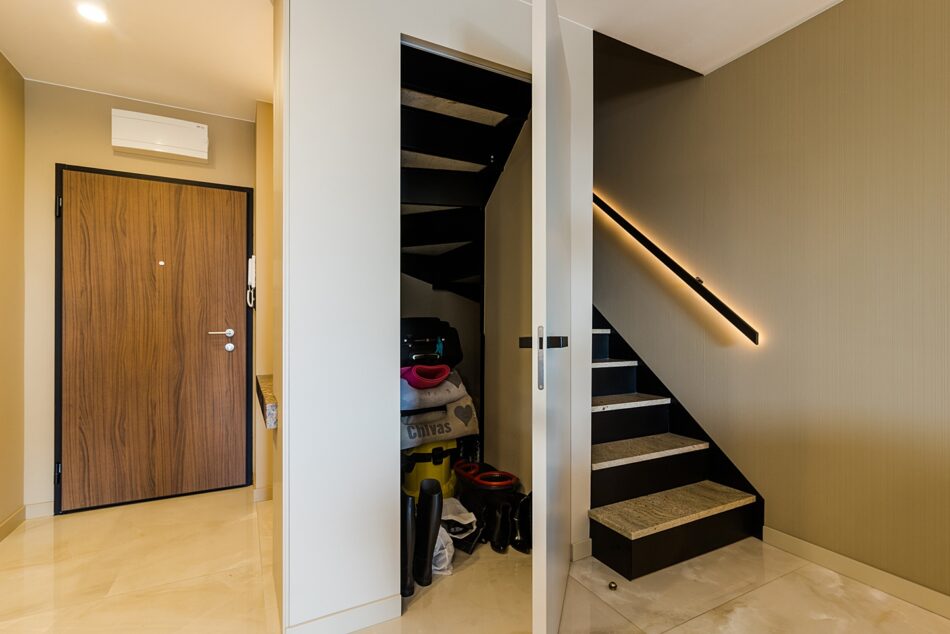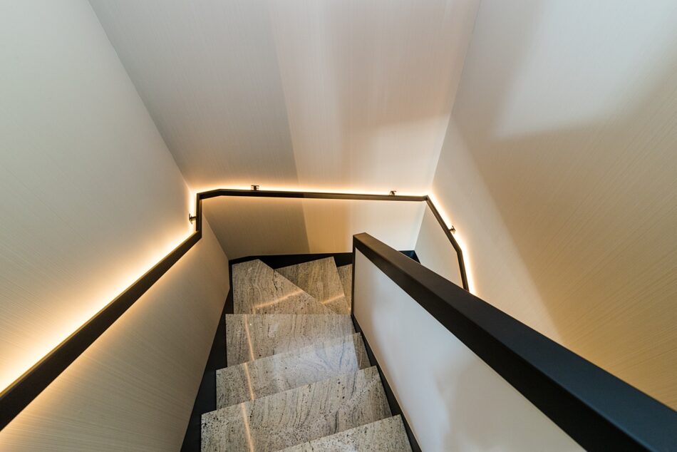 - Schody prowadzące na drugą część penthouse’u wykończone są z granitu.