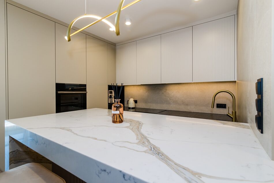 - Blat wyspy kuchennej wykonany z konglomeratu kwarcowego, a blat roboczy z satynowego granitu w odcieniu brązu.