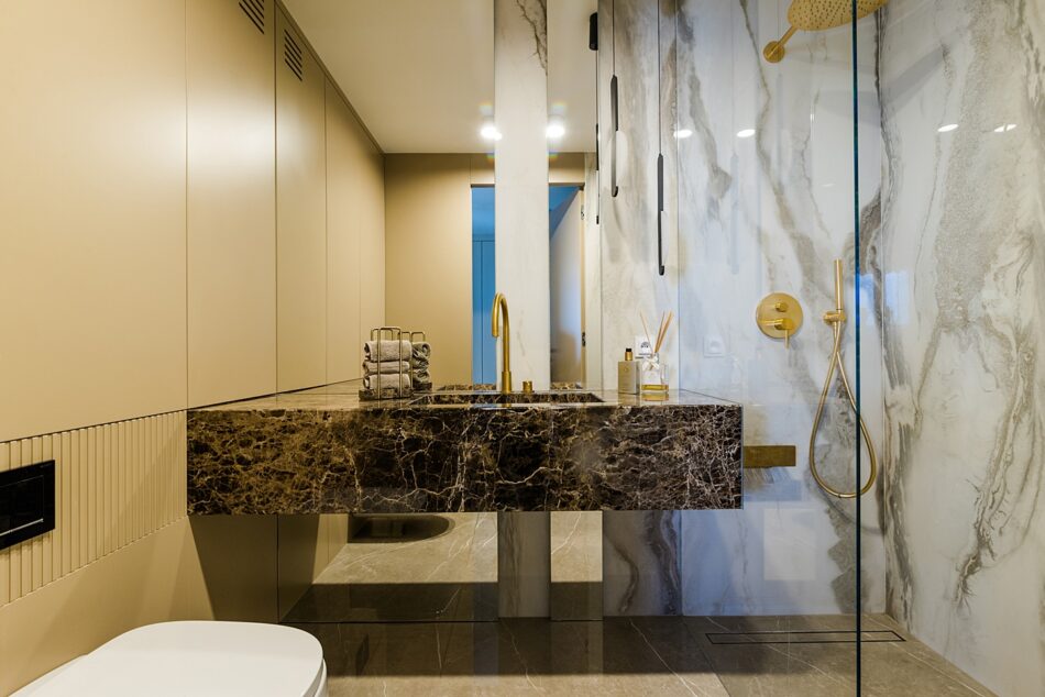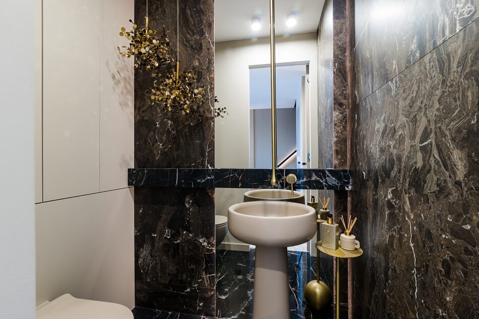 - łazienka na dole wykończona jest z płytek Marazzi, natomiast łazienka na piętrze wykończona gresem. Jedna z nich posiada umywalkę z marmuru Emperador Dark, druga – designerską umywalkę Flaming Bonola na postumencie z chromowaną lampą w kształcie liści.