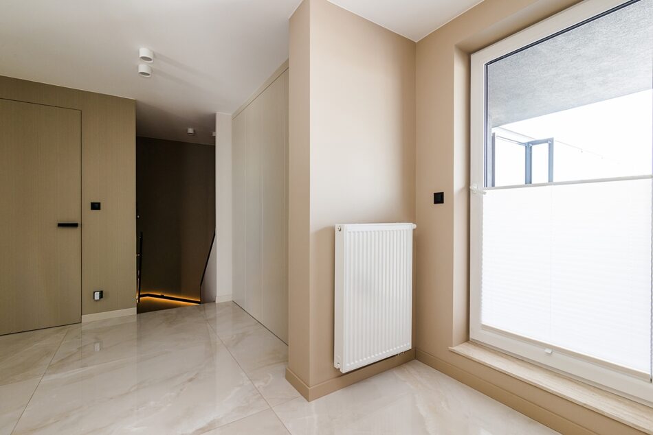 - Podłogi wykończono eleganckim gresem; w części parteru znajduje się ogrzewanie podłogowe.