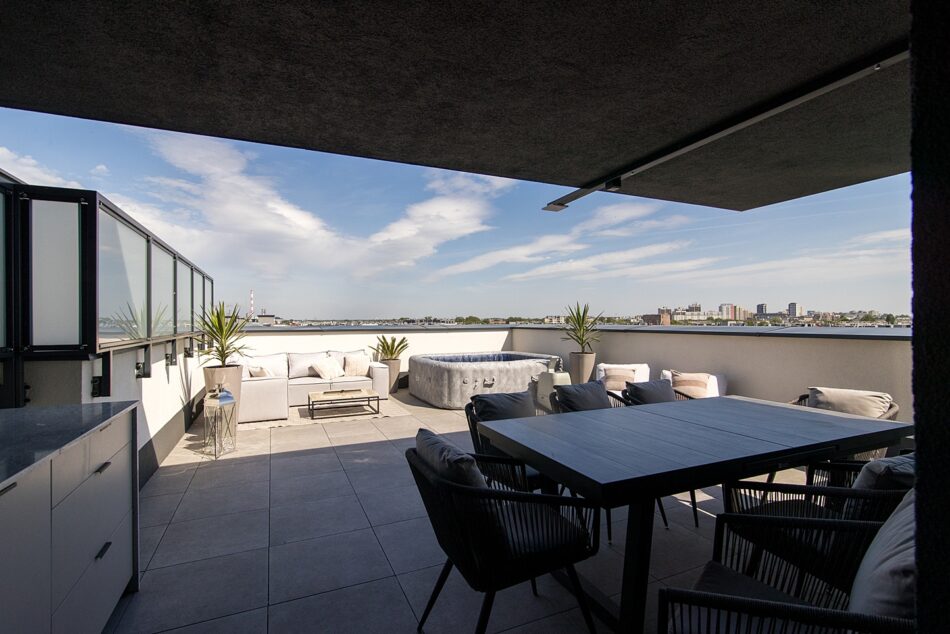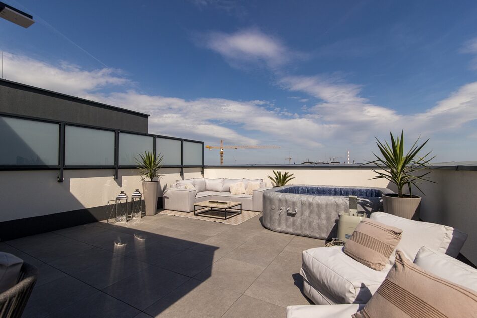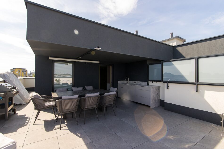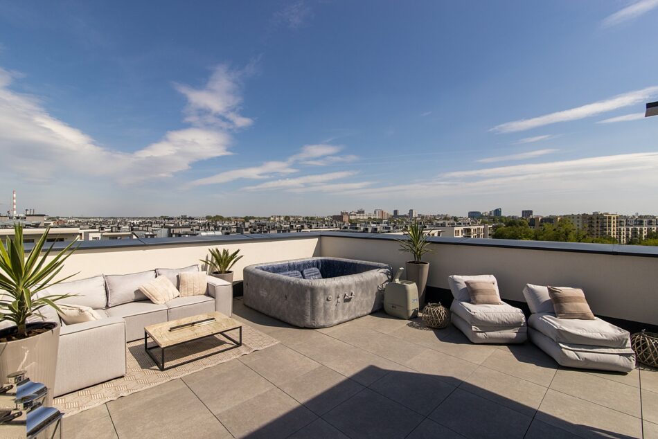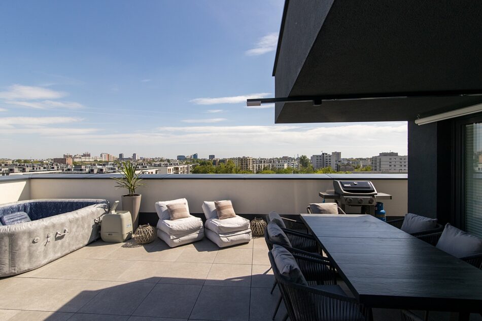 - taras na górnym poziomie – 55,03 m², wyposażony w jacuzzi, rozkładany stół z krzesłami dla 12 osób, kuchnię ogrodową wykonaną z granitu, stolik kawowy, który jest także wykonany z granitu oraz projektor.